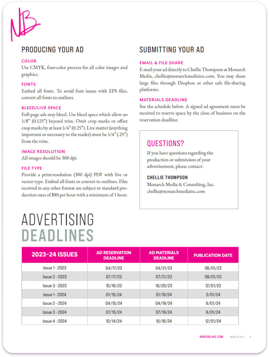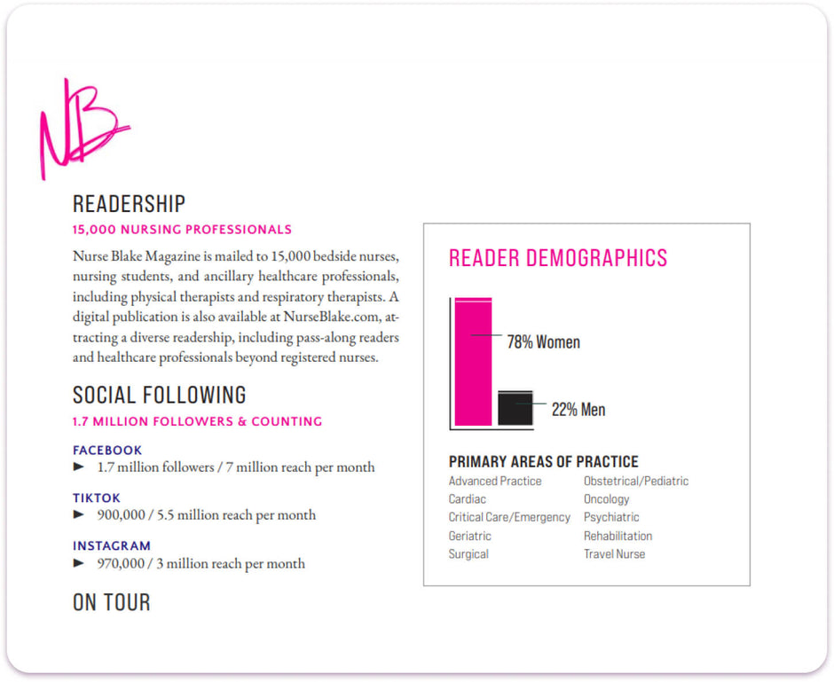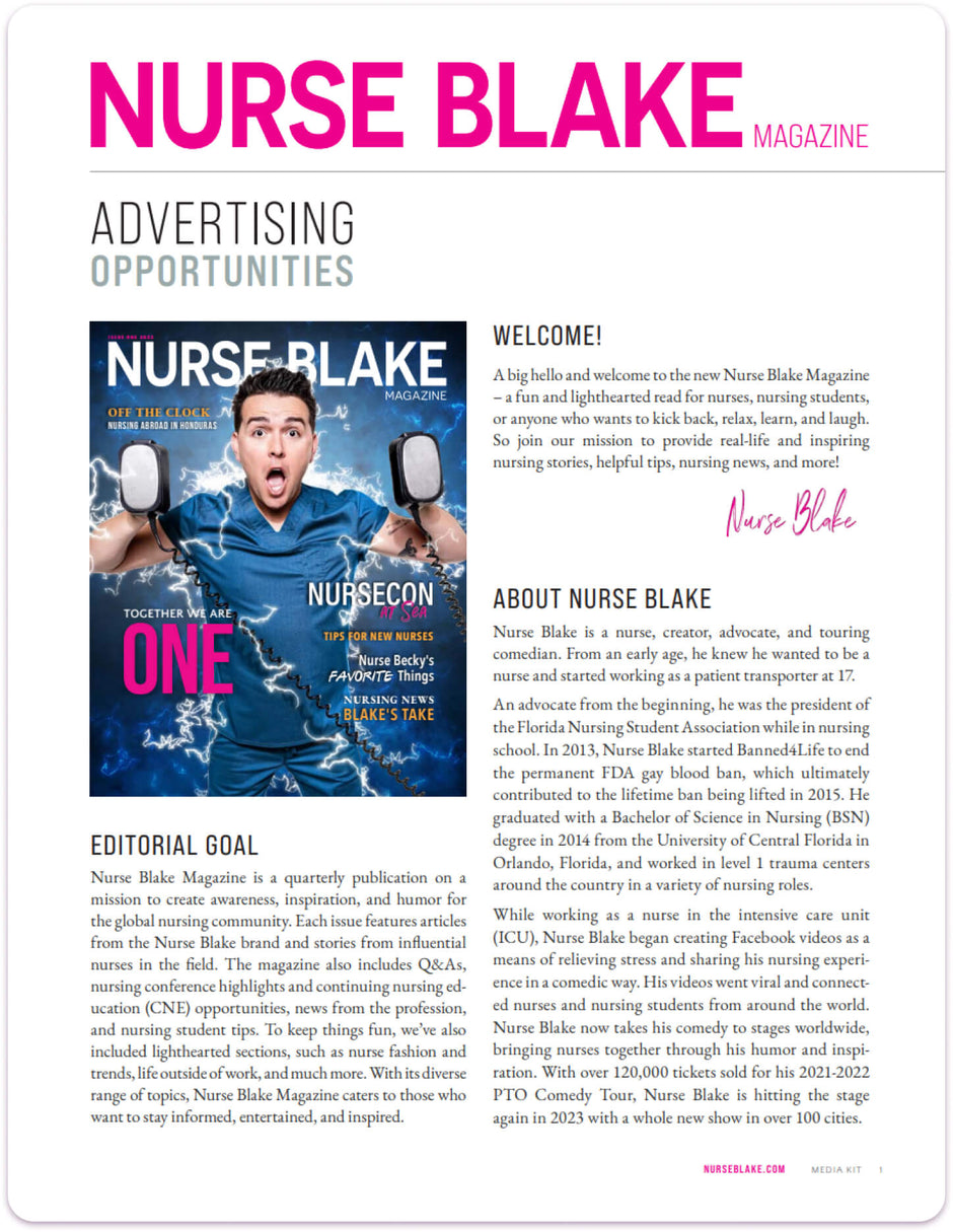 Capture a diverse readership through our print publication, Nurse Blake Magazine. Secure your advertising spot now and connect with an expansive healthcare audience.For inquiries, contact us at nbmagazine@nurseblake.com